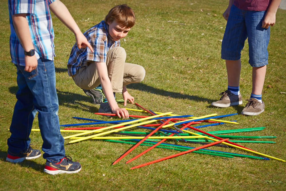 A Super Giant version of the old Pick Up Sticks game. You need the steadiest of hands to succeed in this game of daring tension. Try to remove each stick in turn without moving any of the others. To begin the game, 20 giant pick up sticks are bunched in one hand and set vertically on a flat surface then released suddenly so that they fall in a jumble. Each player in turn attempts to remove a single stick without disturbing any other. If he succeeds he may try again, but if another stick moves the player loses his turn.